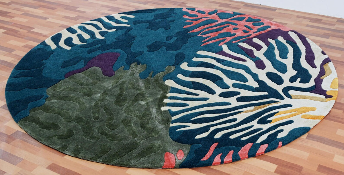 Seaform Rug is a striking centerpiece for any space. Hand tufted with premium craftsmanship, it showcases an overlapping trellis-inspired design in bold, multi-colored tones and ocean plants. Its sculptural curves and soft pile bring both comfort and artistry, making it perfect for modern living rooms, creative interiors, or statement decor.