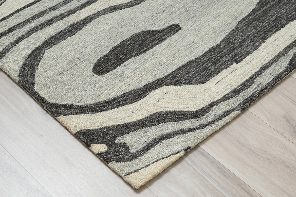 Lithos Wool Rug is crafted from 100 % New Zealand wool using hand tufted construction, creating a soft yet defined surface with natural texture and depth. The design features flowing, organic linear patterns inspired by layered stone formations, rendered in a calm palette of grey, charcoal, and off-white tones. These horizontal lines introduce gentle movement while maintaining a balanced, grounded visual presence. The neutral color composition allows the rug to pair effortlessly with light wood, stone, or minimalist interiors, making it well suited for living rooms, bedrooms, study areas, and open-plan spaces. The combination of premium wool and controlled patterning gives the rug durability, visual clarity, and long-term relevance, supporting modern interiors that value material honesty and understated design.