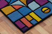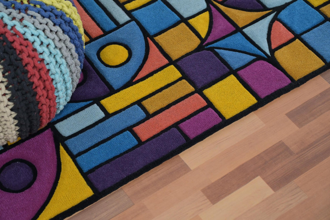 Corner detail view of Chromatic Chaos Rug showing colorful geometric blocks in blue, yellow, and pink with bold black outlines on wooden flooring