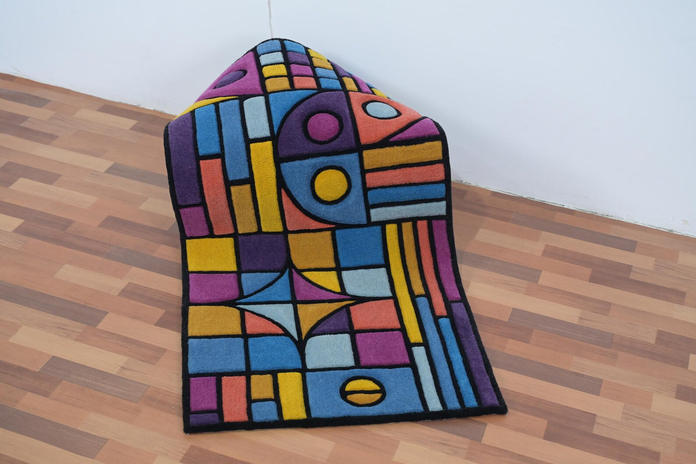 Rolled display view of Chromatic Chaos Rug showing vibrant abstract geometric pattern in blue, yellow, pink, and orange tones on wooden floor background