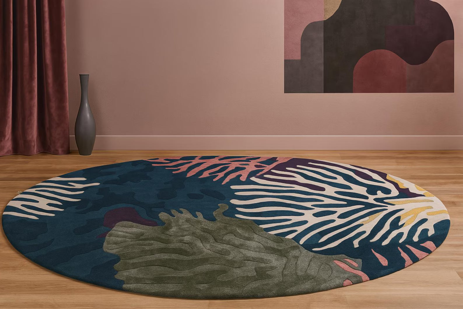 Seaform Rug is a striking centerpiece for any space. Hand tufted with premium craftsmanship, it showcases an overlapping trellis-inspired design in bold, multi-colored tones and ocean plants. Its sculptural curves and soft pile bring both comfort and artistry, making it perfect for modern living rooms, creative interiors, or statement decor.