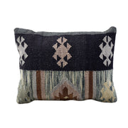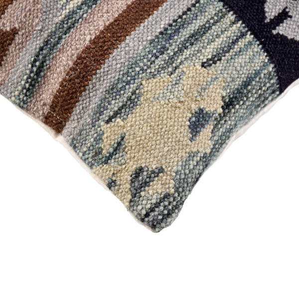 This artisanal wool pillow cover brings a refined tribal aesthetic with its layered motifs and calming earthy palette. Deep navy and charcoal tones anchor the top band, while the lower section blends sage, taupe and warm brown accents for a balanced, textural look. The dense handwoven construction delivers a premium feel, making it a versatile styling piece for sofas, lounge chairs, and bedroom setups that lean toward modern rustic or Nordic-boho design directions.