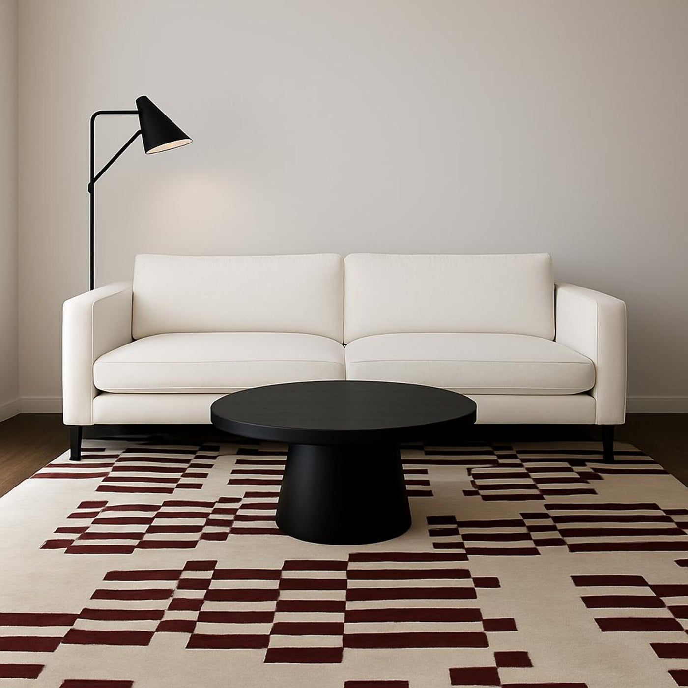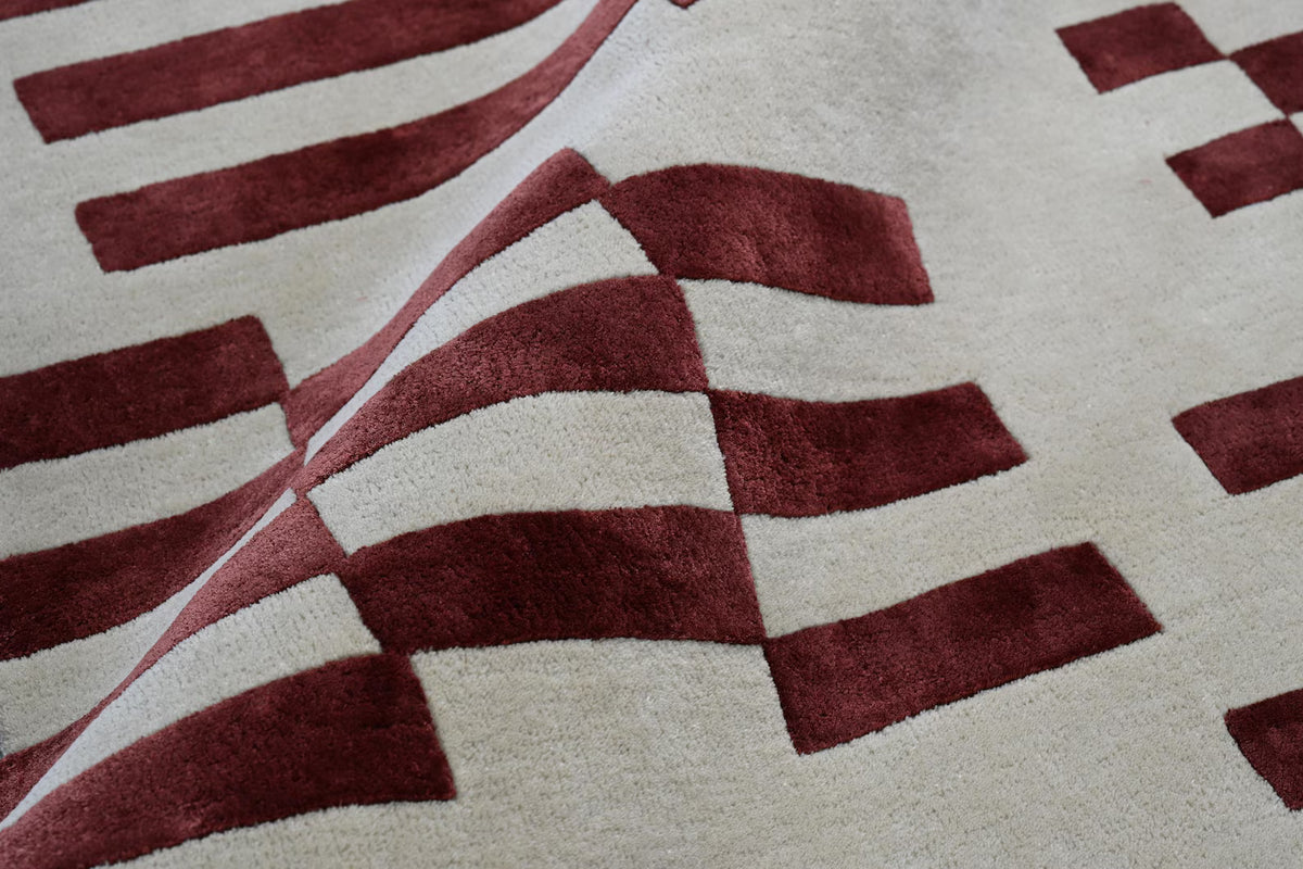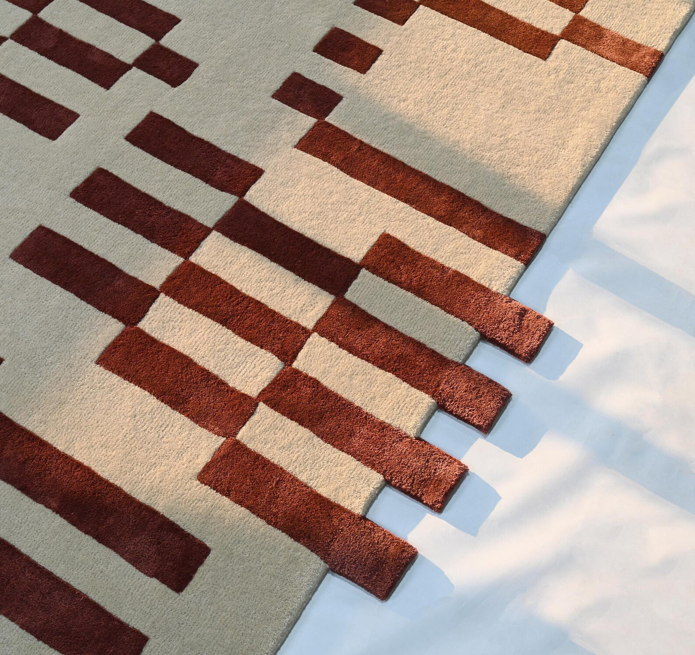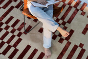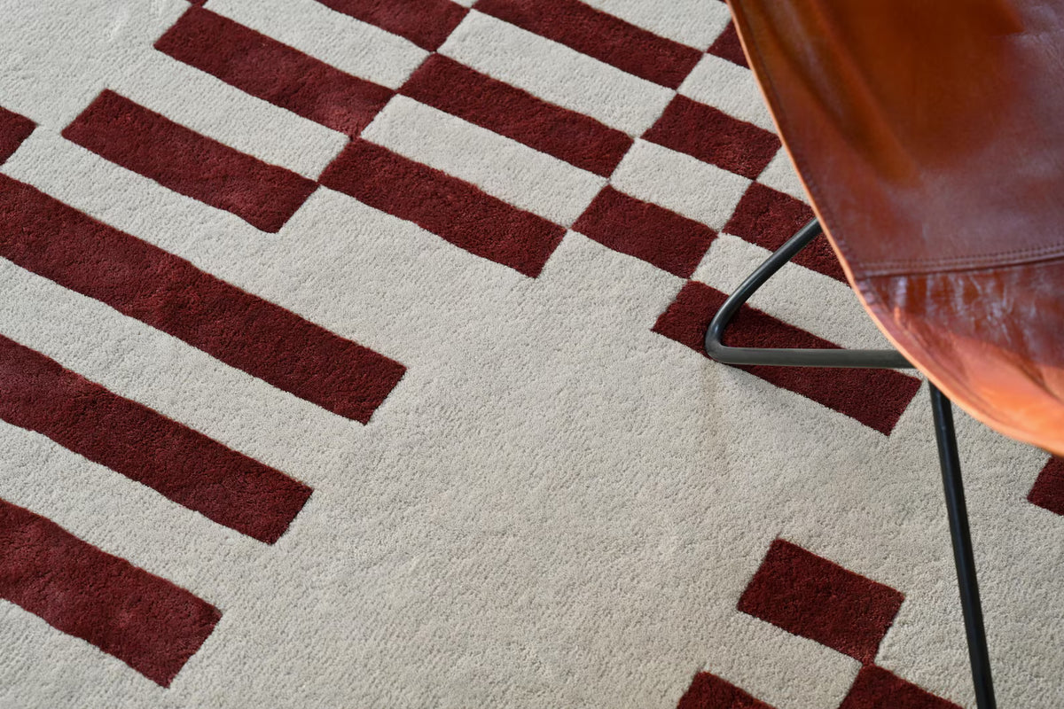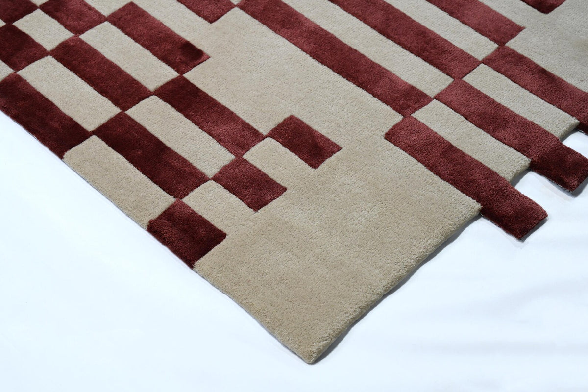 The Pixelated Rug brings modern art to your floor with its abstract grid of oxblood red patterns on a neutral base. Hand tufted with precision, this rug combines bold design with soft comfort, making it a standout piece for contemporary homes.