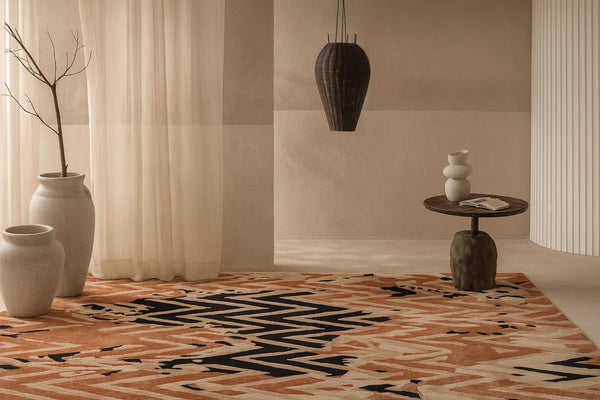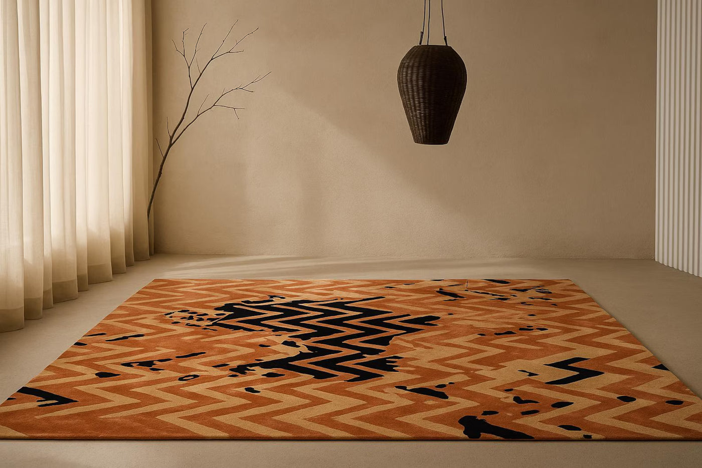 The chevron-distorted pattern blends classic zigzag lines with a modern, fluid interpretation, creating visual movement and edge in any space.
