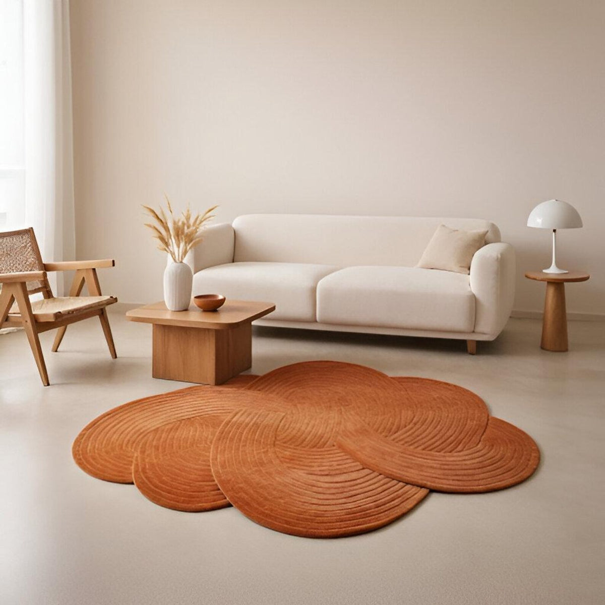 Available in terracotta, cream, and deep green, this rug adapts beautifully to a range of interiors from minimal living rooms to creative workspaces. Its organic silhouette softens harsh lines and becomes a grounding focal point. More than a rug, it’s a functional piece of art designed to merge luxury, texture, and craftsmanship in your space.