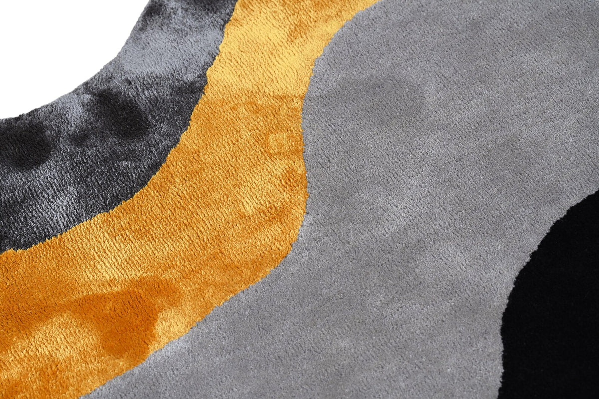 The Molten Flow Rug features bold abstract swirls in yellow, grey, and black, inspired by flowing lava forms. Hand tufted with premium craftsmanship, it combines modern design with comfort — perfect for living rooms, creative spaces, or statement interiors.